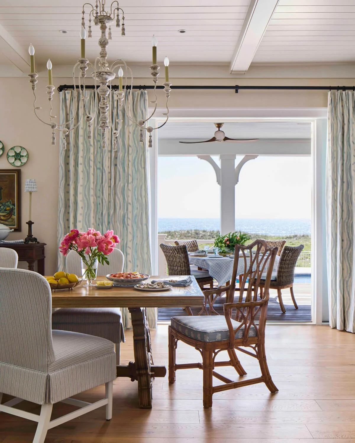 Peaceful and elevated. You can almost feel the calming sea breeze when you gaze into this Amelia Island vacation home, originally built over 30 years ago.  Antique chests, needlepoint footstools, and vintage artwork create a high-end atmosphere that’s in keeping with a historic island getaway. Tongue-and-groove ceilings with sand-colored grasscloth wallcoverings add to the seaside feel, while the muted blues contrast well and mirror the ocean and sky just steps outside of the home. Other details harken back to the origin story of Amelia Island, like the coquina shell plaster on the kitchen hood, a charming technique often seen on exteriors in this region, with roots tied to the original Spaniards who once occupied this area. Many furnishings and decor elements were sourced or refurbished with a local island antique shop and a multi-generation family-owned upholstery shop.